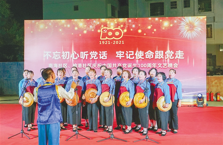 6月30日晚,海口市庆祝中国共产党成立100周年“永远跟党走”群众文艺晚会在万绿园举行。晚会在大合唱《唱支山歌给党听》中拉开帷幕,来自海口市群艺馆、阳光合唱团、海南兰心爱乐合唱团的360名演员激情开唱。
