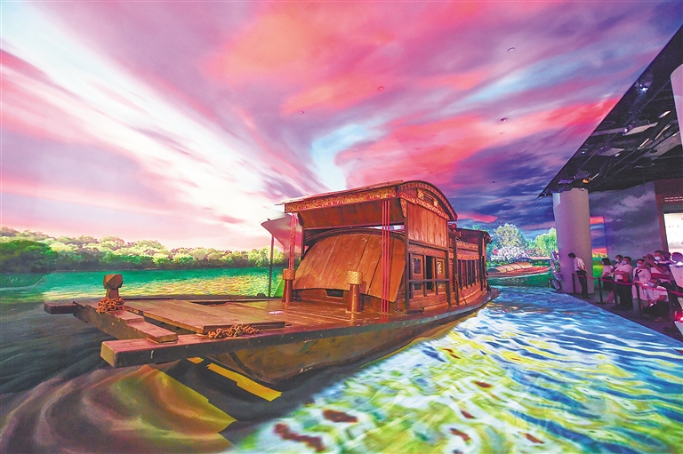 近日,位于浙江嘉兴的南湖革命纪念馆迎来参观热潮,“红船起航”主题展览日均参观人数超过10000人次。图为6月30日,参观者参观红船模型及多媒体场景重现。新华社发