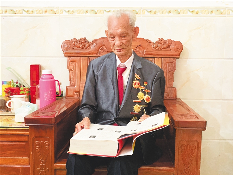 穿好白衬衣、打上红领带,再搭配一件灰色的西装外套……近日,100岁老党员许学清在位于临高县新盈镇安全村的家中穿戴整齐,接受海南日报记者采访。对胸前多枚熠熠生辉的纪念章和奖章,他如数家珍。