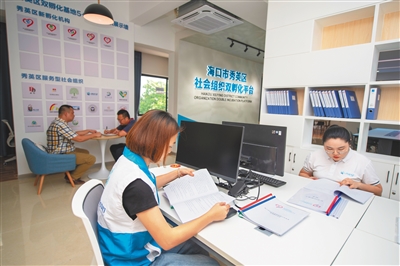 秀英区社会组织双孵化平台项目专员许许介绍,海口市秀英区社会组织双孵化基地,内设运营办公区、初创孵化区、综合孵化区、成果展示区、党建服务区等区块,为社会组织提供共享办公空间、活动开展阵地、硬件设备支持、党建群建辅导、行政财务托管、能力建设培训、资源开发对接、业务咨询指导等一站式综合性服务,以基层治理创新推动海南自贸港建设。
