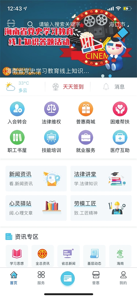 据了解,“海南工会云”App是海南省总工会“网上工会”一期建设工作内容,于2018年正式上线的手机App,主要包括工会组织和工会会员认证入会、困难职工帮扶系统、教育培训系统、就业服务系统、职工普惠商城等内容,覆盖省、市县/产业、基层服务站/企业三级工会工作,全省广大职工、农民工会员均可下载注册使用。