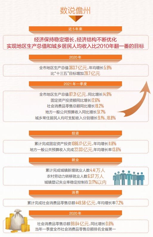 近5年来,儋州经济保持稳定增长,经济结构不断优化。实现地区生产总值和城乡居民人均收入比2010年翻一番的目标。2020年,全市地区生产总值363.7亿元,年均增长5.9%,比“十三五”目标增加28.7亿元。2021年一季度,全市地区生产总值87.21亿元,同比增长14.9%;固定资产投资额同比增长12.6%;社会消费品零售总额同比增长19.2%;地方一般公共预算收入同比增长51.7%;城乡常住居民人均可支配收入分别增长9.1%、18.8%。