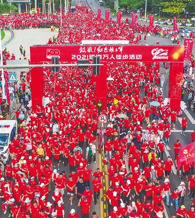 当前的琼海,四处皆是“红”:鲜花怒放,红色的国旗随风摇曳,庆祝中国共产党成立100周年及红色娘子军成立90周年的标语随处可见——“奋斗百年路,启航新征程”“向红色娘子军致敬”“学党史、悟思想、办实事、开新局”……