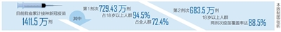 目前我省累计接种新冠疫苗1411.5万剂,其中第1剂次729.43万剂,占18岁以上人群94.5%,占全人群72.4%;第2剂次683.5万剂,18岁以上人群两剂次疫苗覆盖率达88.5%。全人群两剂次疫苗覆盖率达67.8%,我省新冠疫苗人群覆盖率位居全国前列。
