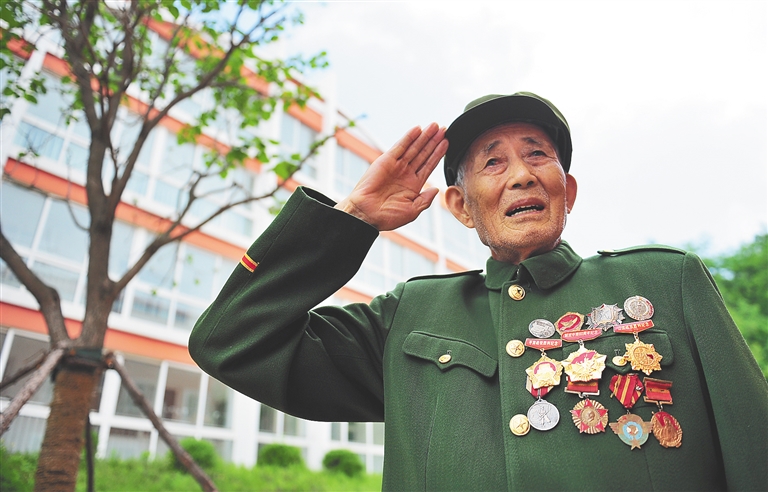 当记者再回头望向老人时,时年96岁、身材瘦弱的他已经在家人的搀扶下坐起,用力挺直佝偻的腰背,脸上挂着微笑。在他的身旁,整齐叠放着一件挂着军功章的志愿军军装。