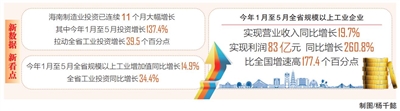 统计数据显示,今年1月至5月全省规模以上工业增加值同比增长14.9%。全省工业投资同比增长34.4%。制造业工业投资方面,石油加工业、医药制造业、化学原料及化学制品制造业、农副食品加工业、机械和设备修理业(飞机维修)5个行业共拉动工业投资增长32.4个百分点,海南炼化乙烯、飞机维修等大项目的投资增长带动作用明显。