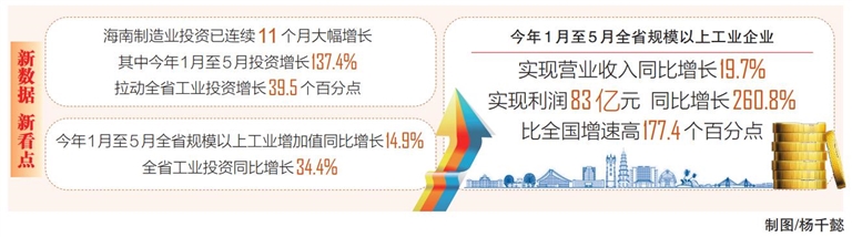 本报海口7月4日讯 (记者邵长春 通讯员吴兰枝 陈玉勇)海南日报记者7月4日从省工业和信息化厅获悉,随着自贸港建设的推进,工业生产恢复等因素影响,今年以来,全省工业保持持续增长。尤其在自贸港政策利好驱动下,海南制造业投资已连续11个月大幅增长,其中今年1月至5月投资增长137.4%,拉动全省工业投资增长39.5个百分点。