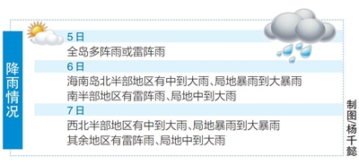 受其影响,7月5日至7月7日期间,南海东南部、西沙和中沙海域、海南岛本岛东部海面、琼州海峡、北部湾海面和本岛西部海面,先后将有强风雨天气;7月6日至7月7日,海南岛陆地将有较强风雨天气。