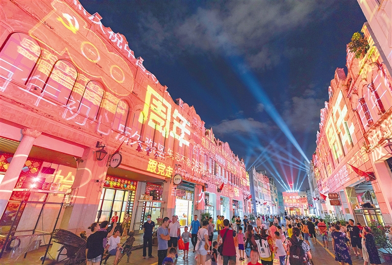 近日,海口市龙华区骑楼老街开展庆祝建党100周年红色主题系列活动。图为《光景·骑楼》建党百年主题光影秀,吸引不少市民游客驻足观看。本报记者 李天平 摄