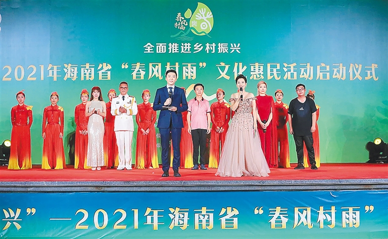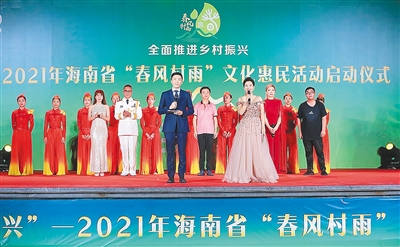 6月28日晚,“全面推进乡村振兴”——2021年海南省“春风村雨”文化惠民活动在施茶村正式启动,广场舞教学、图书阅读、红色故事分享会、科普展播、社会知识普及等系列主题活动以及精彩的文艺演出赢得村民们的热烈掌声。随后,海南省“春风村雨”文化惠民活动还将走进澄迈县文儒镇文儒村、临高县东英镇头洋村、儋州市南丰镇油麻村委会和大村等19个乡镇村落开展一百场多场文化活动,通过“演出、培训、阅读、讲座、展播、宣讲”等形式,把党的关怀送到千家万户,把创业激情送到田间地头,真正做到接地气、暖人心、聚民心,不断坚定群众感党恩、听党话、跟党走的信念和信心。(本版撰文/晁悠 文晶)