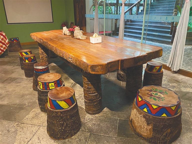 在海口市某客栈里,一张由椰子木制作而成的桌子和椰子树桩砍成的凳子也格外引人注目。