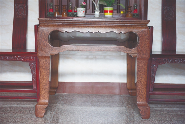 蒙琼生在家里自制了不少家具。走进客厅厅堂,一张布满了细密纹理的传统八仙桌吸引了记者的目光。和许多木制桌子分布树木年轮等纹路不同的是,这张椰子木制作的桌子,桌面上米粒大的纹路走向一致,像豹纹一样的分布方式,但实际星星点点的纹路又比豹纹小。纹路均匀分布,细密而独具特色。棕红色的漆料涂于表面,光滑又显庄重。