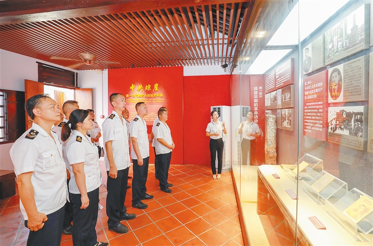 7月5日,在中共琼崖一大旧址,海口市综合行政执法局龙华分局卫生健康行政执法大队的党员开展党史学习教育。中国共产党成立100周年之际,中共琼崖一大旧址成为热门“打卡地”。