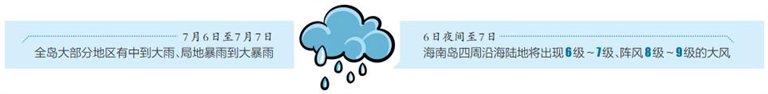 陆地方面,预计受南海热带低压影响,7月6日至7月7日,全岛大部分地区有中到大雨、局地暴雨到大暴雨;另外,6日夜间至7日,海南岛四周沿海陆地将出现6级~7级、阵风8级~9级的大风,气温有所下降,7日大部分地区最高气温可降至29℃~32℃,最低气温中部山区22℃~24℃,其余地区24℃~26℃。