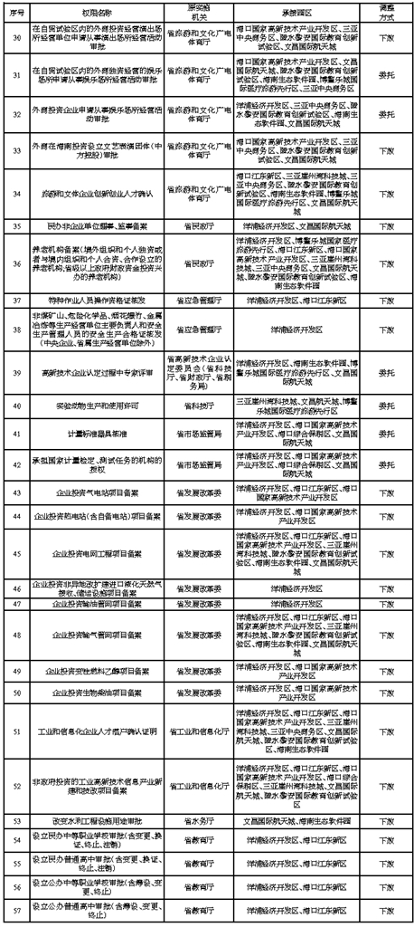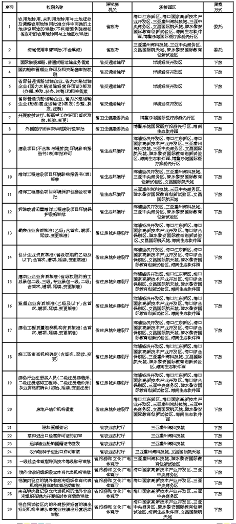 海南省人民政府关于将部分省级管理权限 调整由重点园区管理机构实施的决定