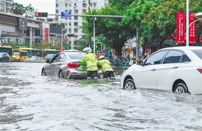 七月六日,在海口金龙路与龙华路交叉口,交警推行抛锚的车辆。 本报记者 李天平 摄