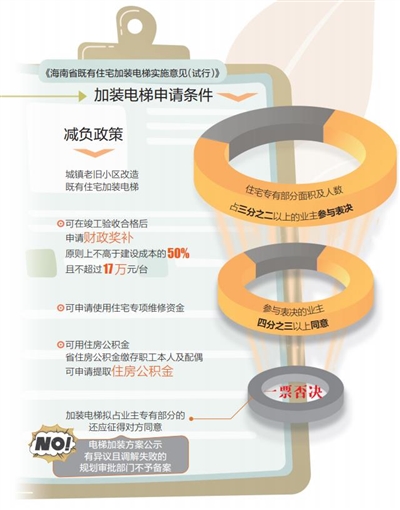 为排解老旧小区加装电梯“堵点”难题,省、市相关主管部门纷纷推出鼓励政策,比如今年3月出台的《海南省既有住宅加装电梯实施意见(试行)》提出,住宅专有部分面积及人数占三分之二以上的业主参与表决,且参与表决的住宅专有部分面积及人数占四分之三以上的业主同意,即可申请加装电梯,相比此前,降低了征集意见阶段的门槛;属于城镇老旧小区改造范围的既有住宅加装电梯的,竣工验收合格后可申请财政奖补,奖补比例原则上不高于建设成本的50%,且不超过17万元/台;还可按照有关规定申请使用住宅专项维修资金。