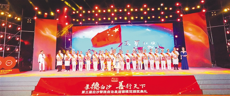 7月8日晚,备受关注的第三届白沙黎族自治县道德模范颁奖典礼在该县文化广场举行。在光彩耀目的灯光下,一名名朴实无华的道德模范依序走上大舞台,场下的观众用心聆听榜样的正能量故事,听到动情处,有人眼噙泪水,大伙以一阵阵如潮涌般的掌声致以内心最崇高的敬意。多年来,正是这一股股崇德向善的力量,在潜移默化中浸润着每一名白沙人的心田,助力凝聚起打造海南自由贸易港中心花园的精神力量,白沙也迈上了催人奋进的新征程。