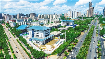 7月8日,航拍海南省图书馆二期项目。目前,该项目已完成外立面装修工程,正有序进行内部精装修和地面园林等施工,争取今年9月底提前竣工。