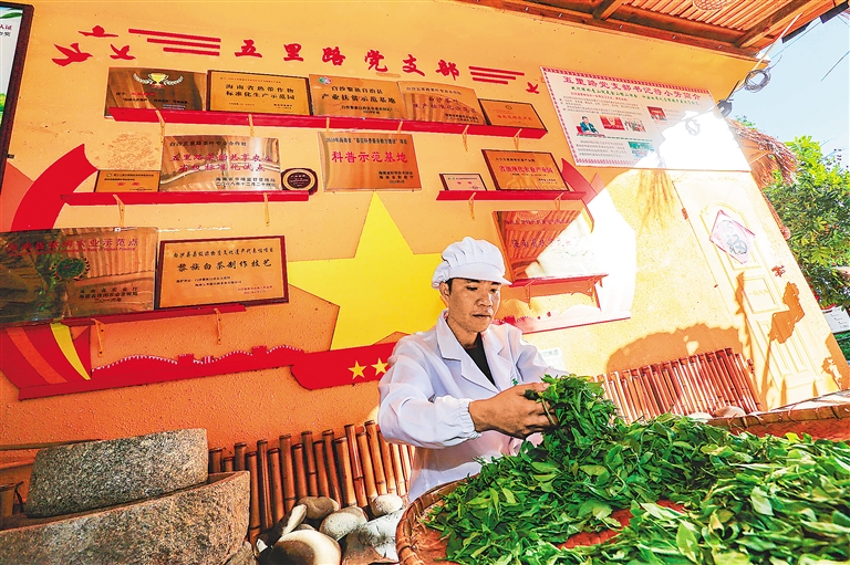 7月9日,在白沙黎族自治县牙叉镇五里路有机茶园,工作人员在忙制茶。