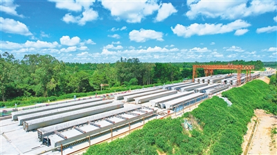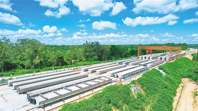 7月11日,航拍国道G360定安至澄迈段公路项目侍郎互通段施工现场,目前该段箱梁预制任务已全部完成,成为全线率先完成箱梁预制标段。据悉,该项目土建工程目前总体完成约80%,其中路基工程完成90%以上,桥梁工程完成70%以上。 本报记者 封烁 摄