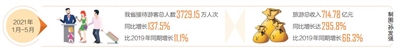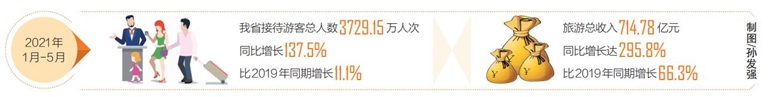 继今年一季度实现开门红,我省旅游经济二季度仍呈现出“淡季不淡”的火热态势,使得今年上半年我省旅游市场持续保持高位——2021年1月-5月,我省接待游客总人数3729.15万人次,同比增长137.5%,比2019年同期增长11.1%,旅游总收入714.78亿元,同比增长达295.8%,比2019年同期增长66.3%,经济效益显著提升。