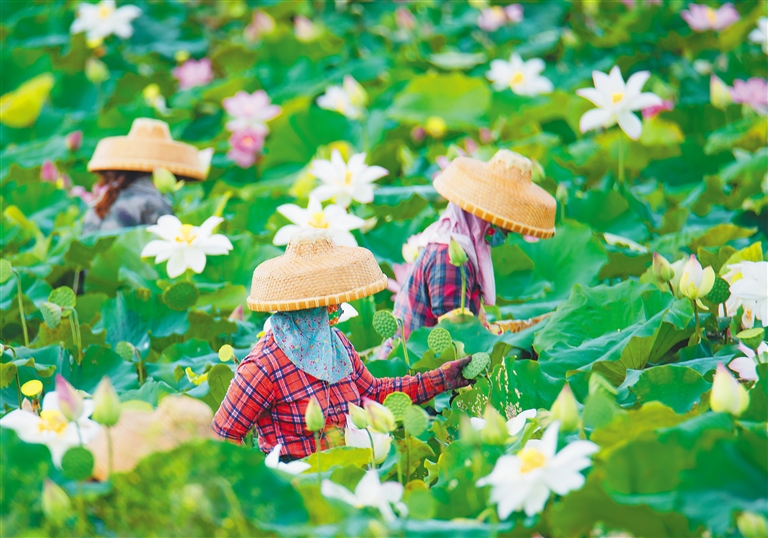 7月10日,琼海市嘉积镇田野上数百亩荷塘荷花盛开,农民在采摘莲蓬。嘉积镇采取“公司+农户+合作社”形式,引种太空莲等莲花新品种在龙寿洋万亩田野公园推广种植。