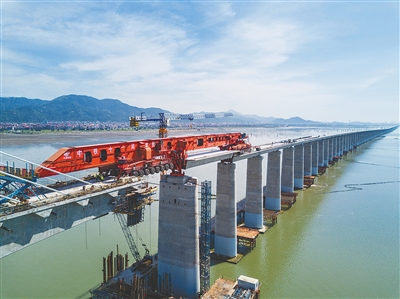 7月11日,在新建福厦铁路湄洲湾跨海大桥建设现场,中铁十一局工人协同“昆仑号”千吨级运架一体机架设该线路最后一孔40米箱梁。