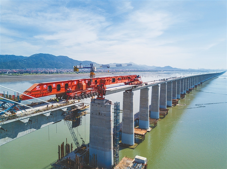 当日,我国自主研发的“昆仑号”千吨级运架一体机在中铁十一局承建的新建福厦铁路湄洲湾跨海大桥建设现场,圆满完成最后一孔40米高铁箱梁架梁任务。