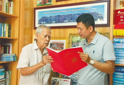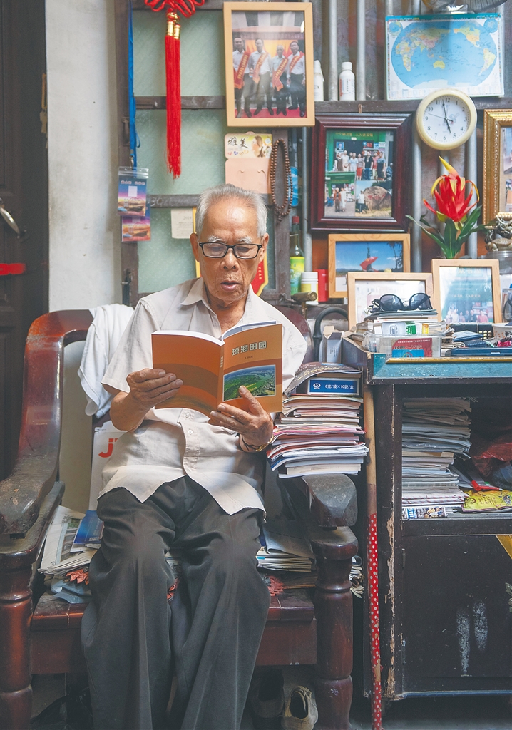 这位白发老人就是大众书屋的主人,有着61年党龄的琼海市民政局原副局长、退休干部王国民。他将自家房子的一楼改造成免费书屋,藏书一万多本,各类报刊数千份,23年来花费数万元自费买书,只为让街坊邻居有书读、读好书。