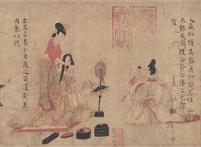 铜镜的镜面光洁,最实用处当然便是照面。正所谓“对镜贴花黄,弄妆梳洗迟”,闺中佳人弄妆画蛾眉,少不得一面湛光如许的铜镜。东晋顾恺之的名作《女史箴图》中就绘有魏晋女性对镜梳洗的画面:左侧一贵妇跽坐于席上照镜,身后有一女侍为其梳头,镜台高立,其上置一圆形铜镜。右侧的女子左手执镜,右手对镜自理,镜中可见其侧视的清秀面容,那种顾影自怜的神态尤为写神。照镜弄妆的妇人们幽雅淑娴,姿态端庄,充满魏晋女性闺房的生活气息。