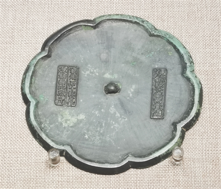 除却《女史箴图》中出现的圆形镜,中国古代铜镜的样式还有葵花形、菱花形、方形、桃形、钟形和瓶形等多种。像江苏仪征市博物馆所藏的唐“千秋”铭双鸾瑞兽花鸟镜就是八瓣葵花镜的代表,匀致的整体布局,对称的画面中又略有变化,这样一面形制和纹饰都颇具艺术品位的铜镜,其主人想必应是达官显贵的家眷。