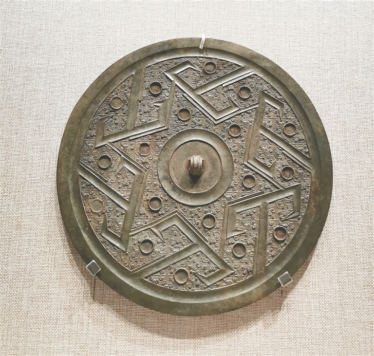 博物馆中的铜镜多以镜背示人,缘于其正面素洁,并无太多观赏性,而背面则有反映其时代特色的纹饰和铭文。春秋以前的铜镜多是以几何形的纹饰为主,如七角星纹、叶脉纹和弦纹等。战国时期中国铜镜迎来第一次高峰期,像其中的山字纹铜镜最具特点,已发现的有三山、四山、五山和六山之别,其中四山纹较多,三山和五山次之,六山最为少见。清华艺术博物馆的“万物毕照——中国古代铜镜文化与艺术”展中就展出了一件安徽省文物考古所藏的战国六山纹铜镜,镜背的山字纹绕钮右转,形成一个六角形纹,地纹上还有许多圆形的孔洞,推测原来镶嵌有绿松石等饰物。此镜出自六安白鹭洲566号战国墓,直径27厘米,是迄今发现的最大的一面山字纹镜。