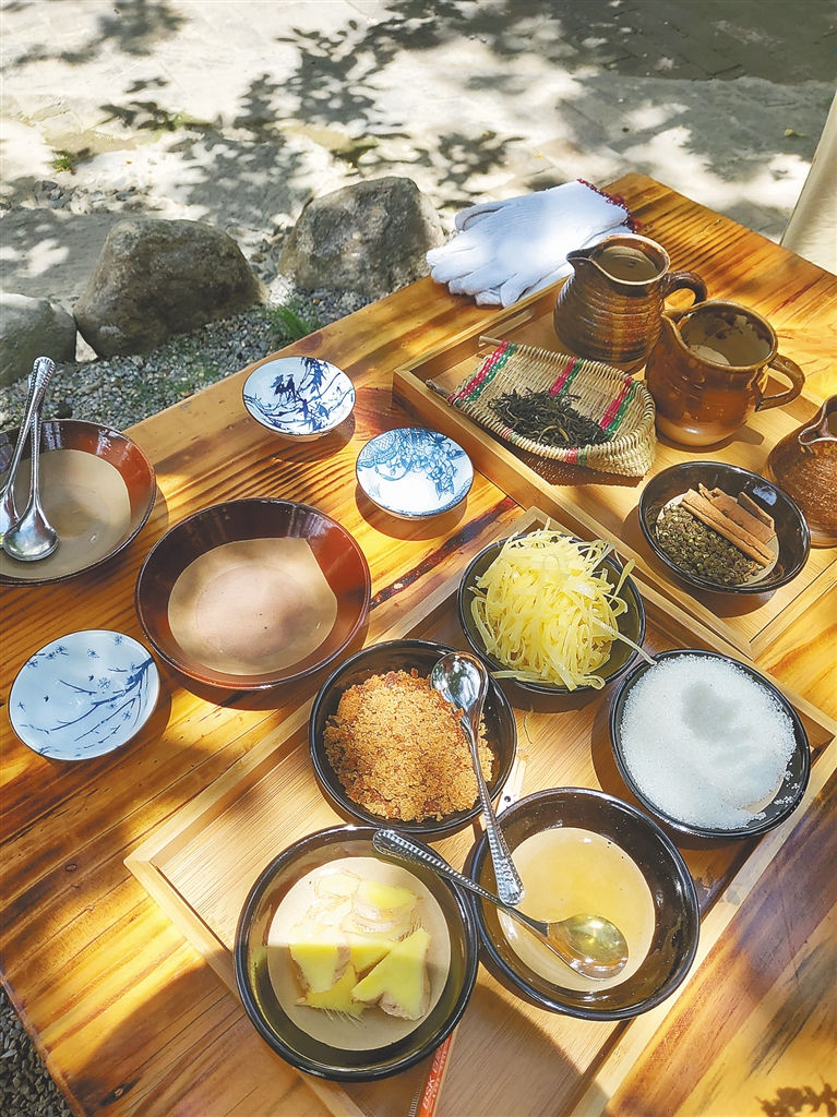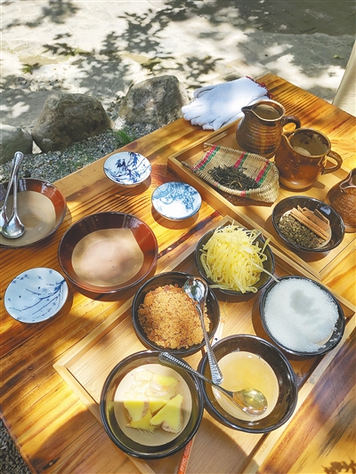 第二道茶为“甜茶”。我们重新用小砂罐置茶、烤茶、煮茶,在茶盅里放入少许红糖、乳扇、桂皮,我尝了一碗沏成的茶,可能是刚喝过苦茶的缘故,这碗茶比想象中的更香甜。