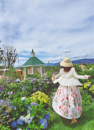 拍照拍倦了,可以在猫米花园的咖啡厅小憩一下。在绣球花环抱的小阳台喝一杯冰拿铁,神清气爽。咖啡店的工作人员介绍,花园有6000多平方米,有欧月、铁线莲、绣球等两万多种植物。它们在一年四季陆续盛开,游客任何时候来,都可以拍出很美的照片。
