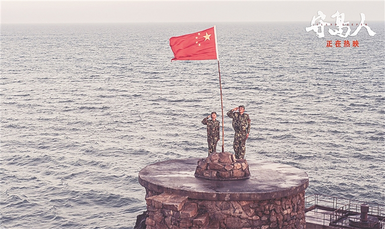 《守岛人》中最让人印象深刻的是岛上升国旗的场景:无论是宁静的海岛还是台风侵袭的海岛,王继才踢着正步,高举着国旗,立定,左右挥舞两圈,然后庄严地插旗、敬礼、唱国歌。影片中多次复现了这一神圣的场景,以仪式化定格在观众心中。王继才作为民兵代表,在和平年代用一生守护荒岛的壮举,正是无数部队官兵保家卫国的缩影,让人油然而生敬意。影片中,旁观升旗现场的只有王仕花一人;影片外,这面国旗却高高飘扬在每个中国观众的心中。
