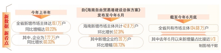 自《海南自由贸易港建设总体方案》发布至今年6月,海南新增市场主体共计42.8万户,环比增长52.31%;其中新增企业约20万户,环比增幅达到136.73%。