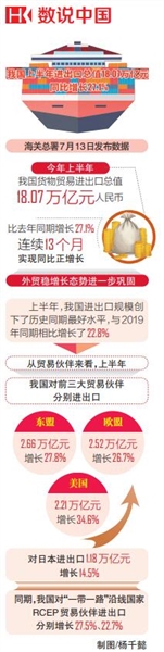 13日,中国上半年外贸成绩单出炉,18.07万亿元的进出口规模创历史同期最好水平;27.1%的增速实现了连续13个月同比正增长。在“十四五”开局之年上半年,外贸稳中向好、韧劲十足。