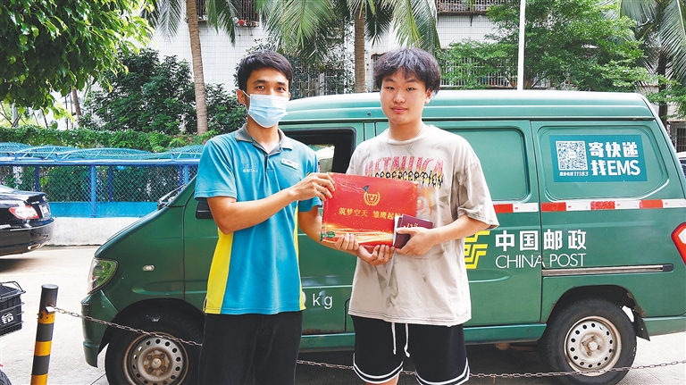 本报海口7月14日讯 (记者陈雪怡 通讯员黄文燕)“很高兴能考上理想的大学,上了大学会继续努力学习,加强身体锻炼,努力为国防事业作贡献。”7月14日16时,被中国人民解放军空军航空大学录取的海口中学高三考生陈帅收到了中国邮政集团有限公司海口市分公司国贸营业部投递员郑在亮送去的高考录取通知书,这是今年我省邮政投出的第一封高考录取通知书,标志着2021年我省高考录取通知书寄递工作全面启动。