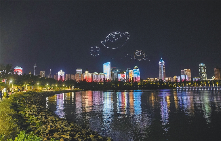 随后,一场无人机集群表演让现场的气氛达到高潮。520架次无人机为广大市民游客以及参加全媒体海南行活动的编辑记者带来一场集科技性、艺术性为一体的视觉盛宴。本次无人机表演秀表演时长约10分钟,共有8幅画面。期间将结合海南自贸港、海口文旅热点,以夜空为幕布,讲好阳光海口的故事,展示自贸港新形象。