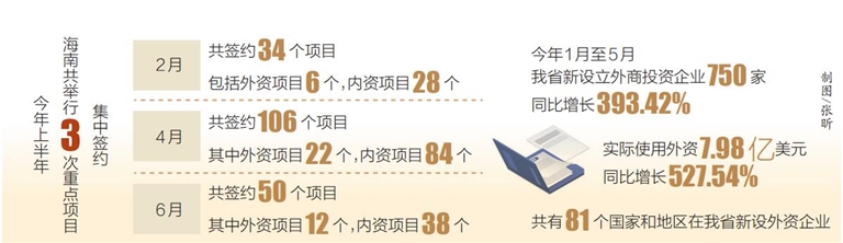 海南逢双月举办重点项目集中签约,逢单月举办重点项目集中开工,积极吸引符合产业发展方向的各类市场主体参与海南自贸港建设。据统计,今年上半年,海南共举行3次重点项目集中签约活动,共签约项目190个,协议投资金额超过900亿元。