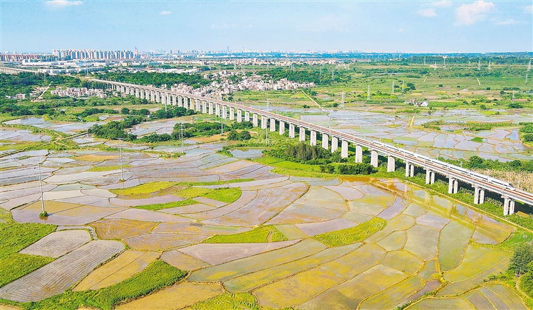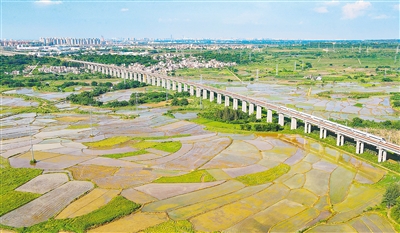 7月16日,在澄迈县老城镇的一处水田,一列动车驶过。时下,海南各地陆续进入晚稻种植时节,相关部门做好水利灌溉工作,确保晚稻插秧顺利进行。本报记者 陈元才 摄