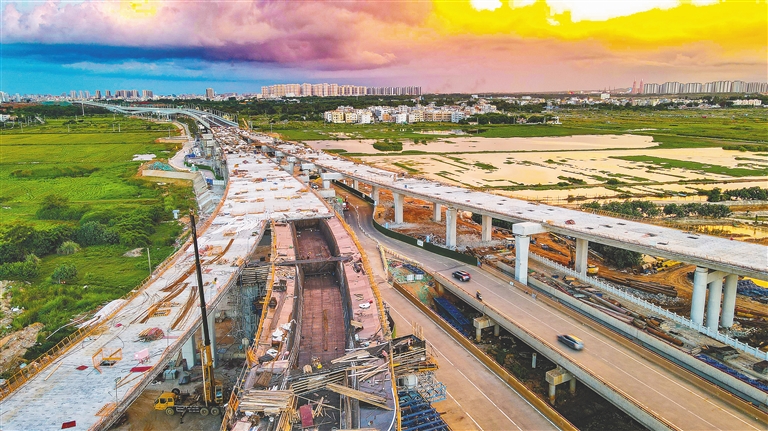 7月16日,在海秀快速路二期延长线和G15沈海(沈阳—海口)海口段连接处,工作人员正忙着施工。作为海南省重点建设项目,G15海口段项目建成后,可满足未来新海港疏港交通的需求,改善交通出行环境,促进沿线区域经济发展。本报记者 陈元才 摄