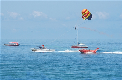 7月18日,游客在三亚市天涯海角游览区体验玩海项目。近年来,三亚顺应游客“求新求特”的旅游消费需求,不断开发新的特色海洋旅游产品,海上游乐器材和设施日渐完善,实现从“观光式看海”向“立体化玩海”转变。