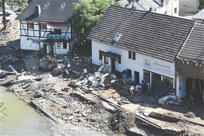 7月18日,在德国舒尔德,人们在受损房屋前清理垃圾。