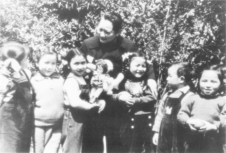 两人在交谈中走下车厢,宋庆龄身穿黑色旗袍,戴着一条白色纱巾,步履轻松,光彩靓丽,看不出一丝疲惫。众人纷纷鼓掌,表示热烈欢迎,宋庆龄走上前去与大家一一拥抱。欢呼之余,突然人群中出现一群幼童,手持鲜花向宋庆龄跑来,欲将手中的鲜花献给她。这群幼童是来自“洛杉矶”保育院的孩子,他们个个神采飞扬,天真无邪。宋庆龄亲切地弯下腰,接过孩子们手中的鲜花,回给他们大大的拥抱。随后直起身来,对着毛泽东庄重地说道:“谢谢主席!”