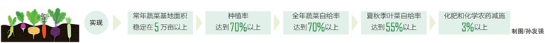 根据《实施方案》,今年海口将新建经济实用型大棚(包括网棚、简易棚、农光互补光伏蔬菜大棚等)5000亩,使该市蔬菜大棚面积达到1万亩以上;推进2万亩高质高效“菜篮子”标准化生产基地建设,提升常年蔬菜基地土壤地力;完善现有基础设施较为落后的常年蔬菜基地水(排灌)、电、路等基础设施;多措并举实现常年蔬菜基地面积稳定在5万亩以上,种植率达到70%以上,全年蔬菜自给率达到70%以上,夏秋季叶菜自给率达到55%以上,化肥和化学农药减施3%以上,确保蔬菜品质和质量安全。