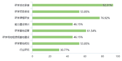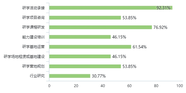 1、基本情况:绝大多数的研学机构拥有接待研学团体活动的能力和经验,研学服务体系相对完善。其中76.92%的机构自主开发研学课程,61.54%的机构有基地运营能力。
