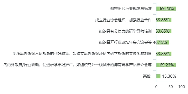 建议岛内相关部门出台行业规范标准,增加高水平培训项目,落实人才培养计划,辅助研学机构、基地扩充研学导师数量,提高团队业务能力。