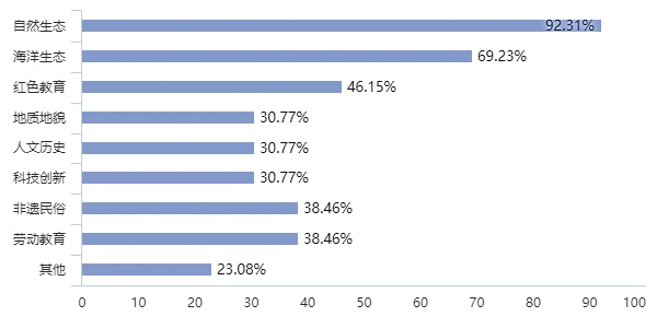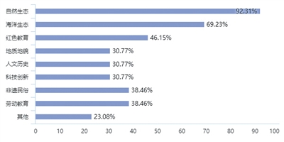 2.课程情况:海南省内研学机构在设置课程主题上对本土特色元素尤为钟爱。研学机构最热衷的三类课程为:自然生态、海洋生态及红色教育。市场反馈来看,非遗民俗和劳动教育同样受欢迎。